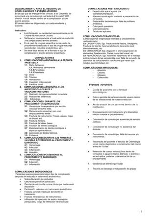 El documento proporciona un formato para registrar complicaciones o eventos adversos en las clínicas odontológicas. El formato debe ser diligenciado por cada estudiante y docente para cada paciente que experimente una complicación o evento adverso, especificando el tipo de procedimiento realizado y complicación ocurrida. La información se recolectará semanalmente por la oficina de atención al usuario.
