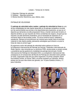 El documento presenta los principales intereses del autor, que incluyen el patinaje de velocidad, los deportes extremos y varios géneros musicales como la electrónica, el pop y la música clásica. Brevemente describe el patinaje de velocidad como un deporte aeróbico y anaeróbico que requiere fuerza, habilidad y resistencia. También define los deportes extremos como actividades que implican cierto riesgo físico y una alta dosis de exigencia mental y física. Finalmente, proporciona definiciones
