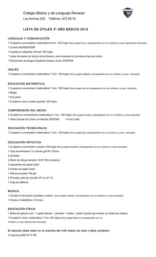El documento presenta la lista de útiles escolares requeridos para el tercer año básico del Colegio Renacer en el año 2013. Se especifican los cuadernos, libros y materiales necesarios para las asignaturas de Lenguaje y Comunicación, Inglés, Educación Matemática, Comprensión del Medio, Educación Tecnológica, Educación Artística, Música y Educación Física. Además, se indica que el estuche debe contener lápices y estar en la mochila diariamente.