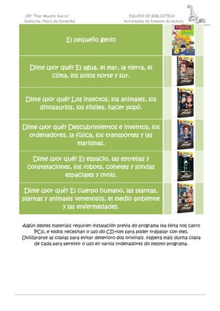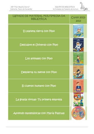 Este documento presenta una lista de material multimedia disponible en la biblioteca del CEP "Pilar Maestú Sierra" en Cadreche, Pobra do Caramiñal. La lista incluye varias series de Pipo sobre temas como la Tierra, el Universo, los animales, el cuerpo humano y más. También incluye otros títulos sobre matemáticas, genios, ciencia y más. Algunos materiales requieren instalación previa en los ordenadores de la biblioteca y todos necesitan ser usados en CD-ROM.