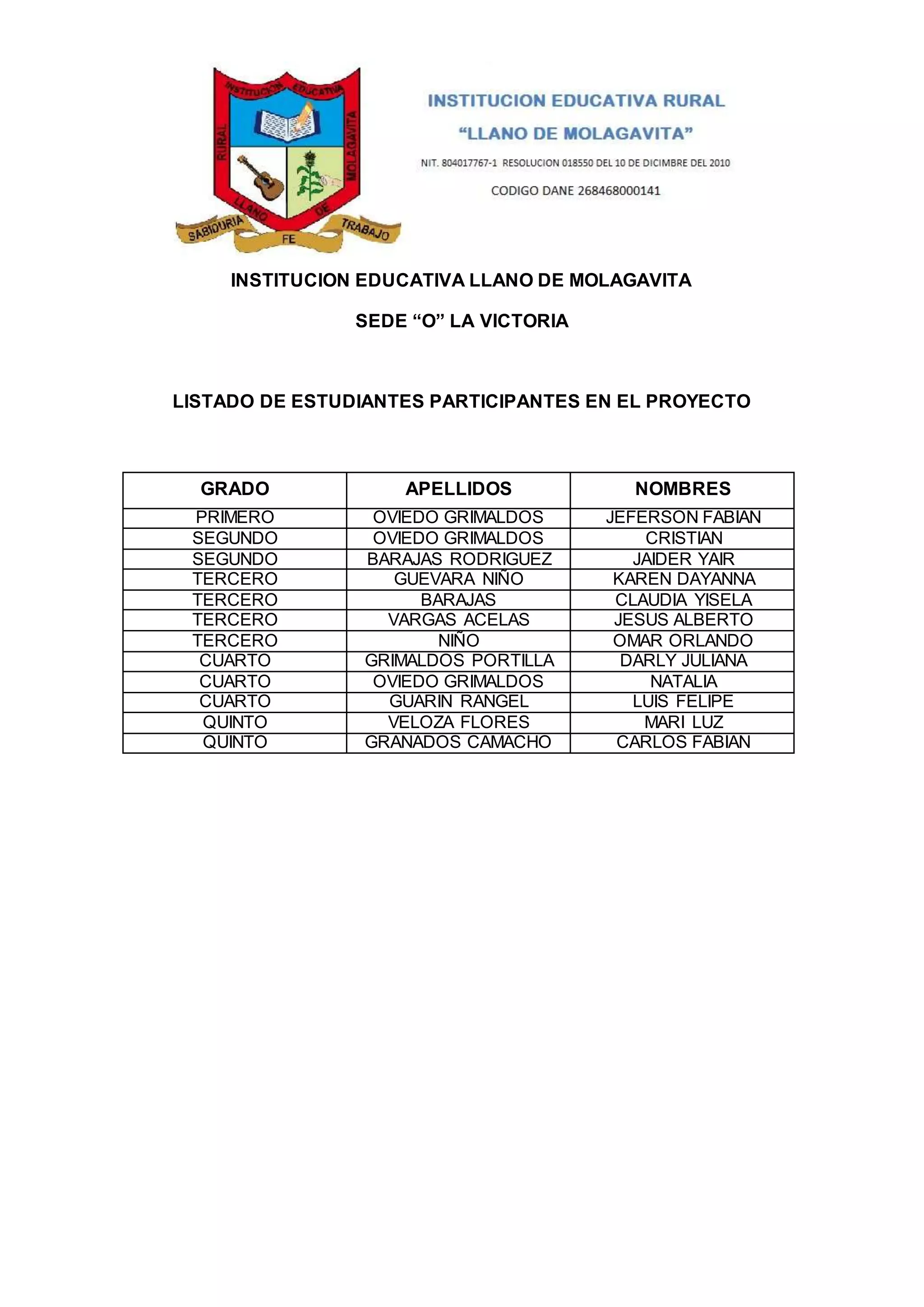 Este documento presenta un listado de 13 estudiantes participantes en un proyecto de la Institución Educativa Llano de Molagavita Sede “O” La Victoria. Los estudiantes se encuentran entre los grados primero y quinto y se enumeran sus apellidos, nombres y grado.