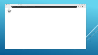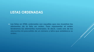 Las listas HTML permiten crear conjuntos de elementos en forma de lista. Existen tres tipos de listas: ordenadas, desordenadas y de definiciones. Las listas ordenadas usan números u otras secuencias para ordenar los elementos, mientras que las desordenadas usan viñetas. Las listas de definiciones relacionan términos con sus definiciones. Se pueden anidar listas de cualquier tipo dentro de otra lista.