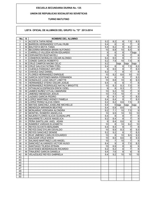 Este documento presenta las listas oficiales de alumnos de 4 grupos (1o. "C", 1o. "D", 1o. "E", 1o. "F") de la Escuela Secundaria Diurna No. 135 en la Unión de Repúblicas Socialistas Soviéticas. Cada lista incluye el nombre, calificaciones y asistencia de cada alumno.