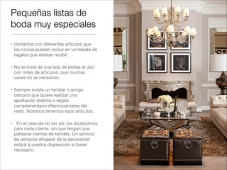 Este documento presenta opciones de regalos especiales para listas de bodas, como vajillas personalizadas pintadas a mano, obras de arte de reconocidos artistas, y detalles para el hogar de alta calidad. Se enfatiza la importancia de los bajoplatos pintados como una forma de darle un toque único a la mesa. El documento también ofrece sugerencias para decorar y complementar diferentes espacios del hogar.