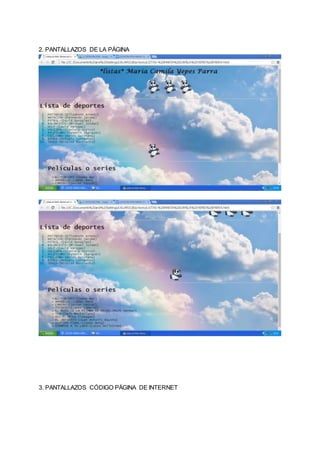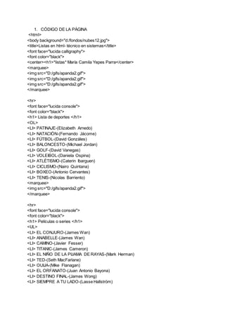 Este documento presenta dos listas en formato HTML. La primera lista enumera diferentes deportes y sus representantes, incluyendo patinaje, natación, fútbol, baloncesto, golf, voleibol, atletismo, ciclismo, boxeo y tenis. La segunda lista menciona películas y series como El conjuro, Anabelle, Camino, Titanic, El niño de la pijama de rayas, Ted, Ouija, El orfanato, Destino final y Siempre a tu lado. El documento también incluye código HTML para el formato