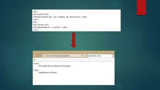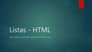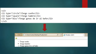 Este documento describe los tres tipos principales de listas en HTML: listas ordenadas, listas desordenadas y listas de definiciones. Las listas ordenadas utilizan números y las listas desordenadas utilizan símbolos como puntos y viñetas. Las listas de definiciones se componen de términos de definición y sus descripciones correspondientes. Las listas son una forma básica de organizar información en HTML antes de avanzar a tablas u otros métodos.