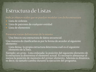 El documento describe estructuras de datos como listas, pilas y colas, enfatizando sus características, implementaciones en C y su utilidad en programación. Se definen listas como secuencias de elementos, las pilas como estructuras LIFO y las colas como estructuras FIFO, cada una con sus respectivas operaciones. Se presentan ejemplos de implementación y modelación utilizando punteros y estructuras de datos, así como consideraciones sobre listas enlazadas y colas de prioridad.