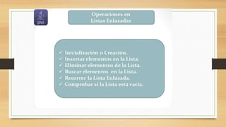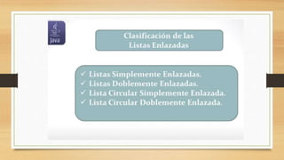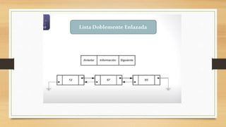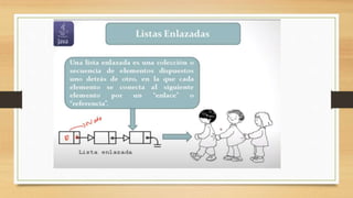 El documento habla sobre listas enlazadas y punteros. Explica conceptos básicos como nodos, enlaces y punteros para referirse a los elementos de una lista.