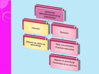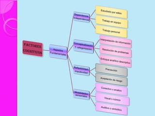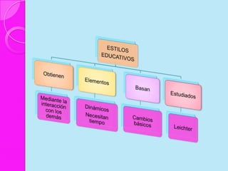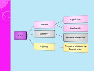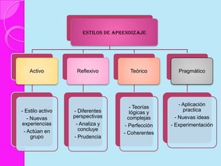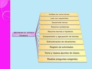 Este documento discute los estilos de aprendizaje, incluyendo la teoría sinérgica de Adam, taxonomías de estilos de aprendizaje, y cómo los estilos se relacionan con aplicaciones didácticas. También cubre la evaluación de estilos de aprendizaje a través de cuatro etapas y ofrece recomendaciones para mejorar los estilos de aprendizaje del alumno y estrategias de enseñanza según diferentes estilos.