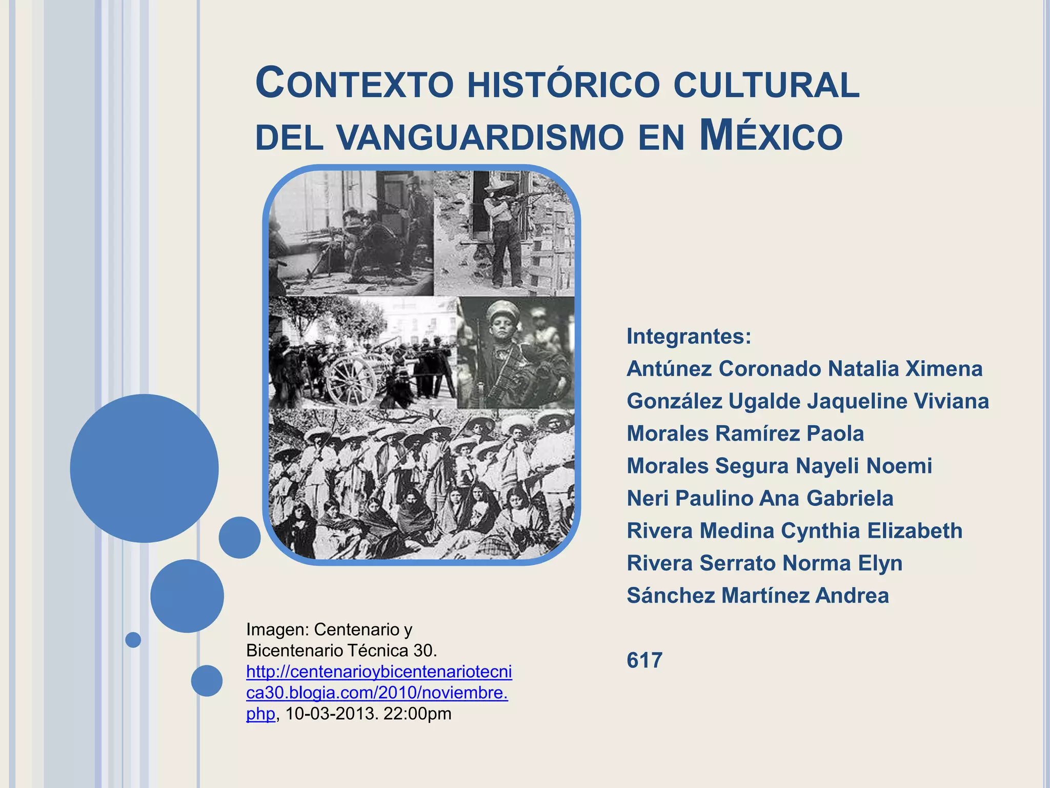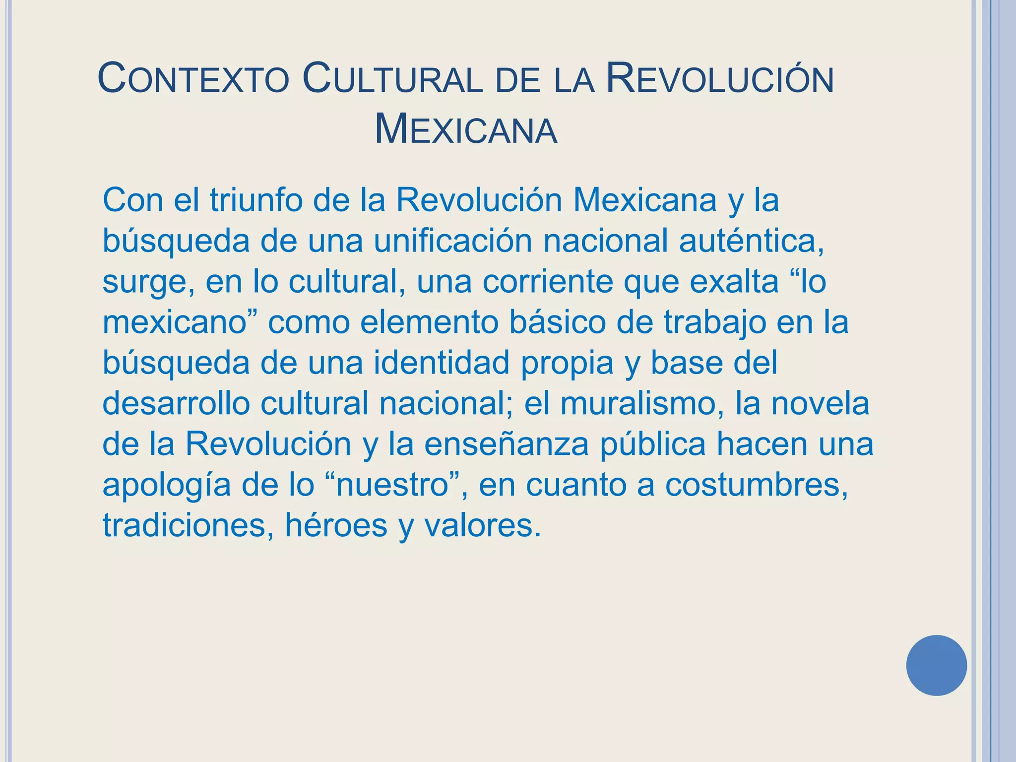 Tras el triunfo de la Revolución Mexicana surgió un movimiento cultural que exaltaba lo mexicano para construir una identidad nacional. El muralismo buscó educar a las masas sobre su cultura a través de grandes murales con contenido político-social. La Revolución comenzó como rebelión contra el dictador Porfirio Díaz y fue liderada inicialmente por Francisco I. Madero hasta su asesinato en 1913, tras lo cual hubo varios años de inestabilidad política hasta el periodo conocido como Maximato durante el