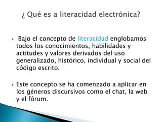 Este documento describe la literacidad electrónica y sus implicaciones. La literacidad electrónica se refiere a las habilidades, conocimientos y actitudes necesarios para comunicarse usando tecnología electrónica. Esto ha llevado al desarrollo de nuevas formas de comunicación como las comunidades virtuales y los nuevos géneros discursivos en línea. Sin embargo, también ha aumentado la brecha digital y se necesita más apoyo para que todos puedan aprovechar plenamente las nuevas formas de comunicación.