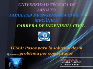 Este documento describe los pasos para resolver un problema por computadora, incluyendo la definición y delimitación del problema, análisis del problema, diseño del algoritmo, codificación, compilación, depuración, documentación, ejecución y mantenimiento. El documento fue escrito por dos estudiantes de ingeniería civil de la Universidad Técnica de Ambato como parte de un curso de pre-lógica.