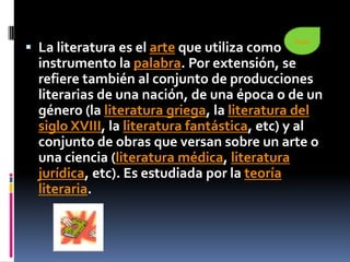 La literatura se define como el arte que utiliza la palabra como instrumento de expresión. A lo largo de los siglos, el concepto y definición de literatura ha evolucionado, pasando de referirse a cualquier creación literaria a limitarse a obras de reconocida calidad estética. Existen diferentes teorías sobre qué características definen a un texto como literario, destacando su énfasis en la forma del mensaje por encima de su contenido y su capacidad de provocar placer estético.