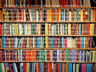 El documento describe la evolución del significado del término "literatura" desde el siglo XVII hasta el siglo XX. Inicialmente se refería a la poesía y la elocuencia, pero con el tiempo pasó a denotar un conjunto más amplio de obras escritas creativas. En el siglo XX, la teoría literaria definió la literatura por su "literariedad", es decir, por las características formales que la distinguen de otros tipos de discurso, como el uso estilizado del lenguaje y la intertextualidad.