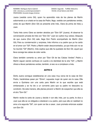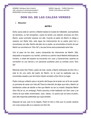 La obra narra la historia de Juana, quien se disfraza de hombre llamado Don Gil para recuperar a su amante Martín. Martín se había comprometido con Inés por orden de su padre. Juana asume la identidad de Don Gil y engaña a Inés y a otros para acercarse a Martín. Sin embargo, su plan genera mucha confusión debido a que otros también se disfrazan de Don Gil. Finalmente, Juana revela su verdadera identidad y se reconcilia con Martín.