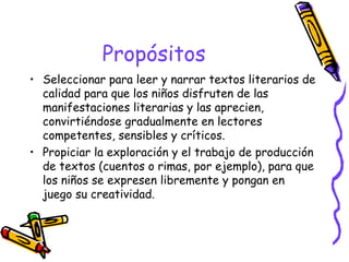 Este documento presenta los objetivos y contenidos de la enseñanza de la literatura, teatro y títeres en la escuela primaria. Los principales propósitos son desarrollar la apreciación de textos literarios, fomentar la creatividad de los niños y dotarlos de herramientas expresivas. Se detallan actividades como escuchar lecturas, intercambiar opiniones, producir cuentos y poesías, presenciar obras de teatro y crear títeres. El docente debe seleccionar obras de calidad y crear