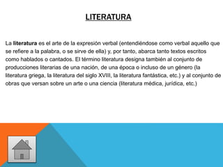 El documento define la literatura como el arte de la expresión verbal que abarca textos escritos, hablados o cantados. Explica que la literatura se refiere al conjunto de producciones de una nación, época o género. Además, distingue entre una concepción extralingüística de la literatura, que considera factores sociales e históricos en su definición, y una concepción intralingüística que se centra en características del lenguaje como el carácter ficcional, la pluralidad de sentidos y el uso