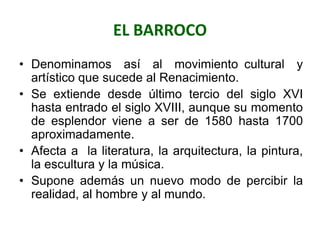 Este documento resume los principales aspectos de la literatura barroca, incluyendo su periodización entre finales del siglo XVI y principios del XVIII, su énfasis en el tema del desengaño y la fugacidad de la vida, su estética basada en la asimetría y el dinamismo en contraste con el renacimiento, y sus características lingüísticas como el culteranismo y el conceptismo.