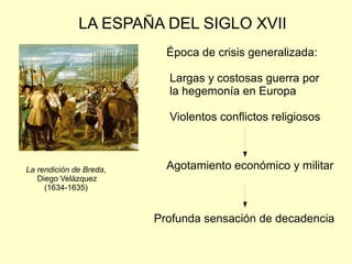 Este documento resume la literatura española del Siglo de Oro o Siglo XVII, conocido como el periodo barroco. Aborda los principales autores como Góngora, Quevedo, Lope de Vega y Calderón de la Barca, así como los temas, estilos y géneros literarios más destacados de esta época, que incluyen el conceptismo, el culteranismo, la poesía, la novela picaresca y el teatro barroco.