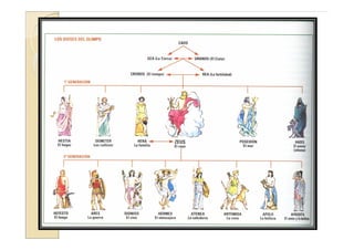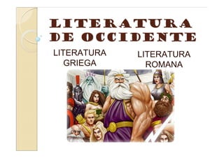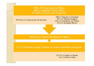 Este documento resume los acontecimientos más relevantes de la literatura griega y romana desde los siglos XIII a.C. hasta el siglo I d.C. En tres oraciones describe la literatura épica, lírica y dramática griega, incluyendo a autores como Homero, Hesíodo, Safo y Eurípides. Luego resume la literatura romana con énfasis en Virgilio, Horacio, Ovidio y Cicerón y los géneros épico, lírico, dramático y oratorio. Finalmente, ofrece detalles sobre la mit