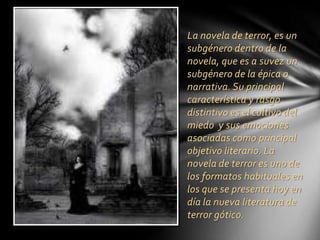 Este documento describe el género de la literatura de terror, incluyendo sus orígenes en el siglo 18 y 19 como reacción al racionalismo. Explora los elementos comunes de este género como ambientes sombríos como castillos y bosques, personajes extraños, y eventos sobrenaturales. También discute autores e historias representativas del género como Drácula y Frankenstein.