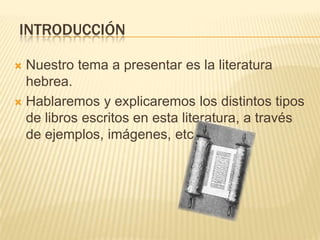Este documento resume los principales tipos de literatura encontrados en la literatura hebrea. Estos incluyen el Antiguo Testamento, que consta de cinco libros y es considerado la palabra de Dios. Otros tipos son los libros históricos, poéticos, proféticos y sapientiales. Los libros históricos hablan de la historia del pueblo judío. Los libros poéticos incluyen los Salmos y el Cantar de los Cantares. Los profetas predijeron eventos futuros. Finalmente, los libros sap