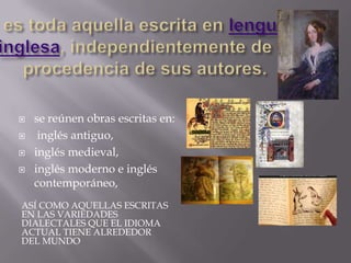 Este documento resume la historia de la literatura inglesa desde la Edad Media hasta la Restauración. Comienza con la literatura anglosajona escrita en monasterios, luego la conquista normanda en 1066 que expandió el uso del inglés. En la Edad Media florecieron los romances y obras de misterio. Geoffrey Chaucer fue el primer gran autor inglés con Los cuentos de Canterbury. La imprenta y la Reforma fomentaron la literatura vernácula durante el Renacimiento. En la era isabelina destacó William Shakespeare con obras ma