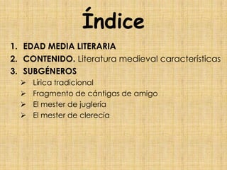 Este documento resume los principales géneros y características de la literatura medieval en España. La literatura medieval se divide en dos periodos y se caracteriza por su transmisión oral, autoría anónima y carácter didáctico. Los principales subgéneros incluyen la lírica tradicional como las cántigas de amigo, el mester de juglaría representado por los juglares que recitaban poemas como el Poema del Mío Cid, y el mester de clerecía escrito por autores cultos como Gonzalo de Berceo y Juan