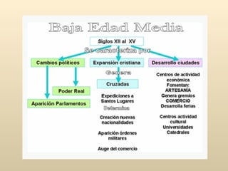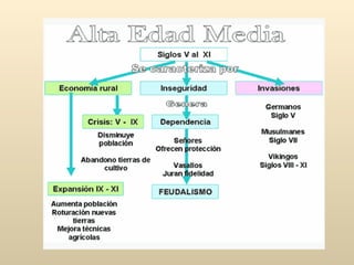 El documento resume el contexto histórico, social y literario de la Edad Media en Europa. Se divide la Edad Media en Alta y Baja, y se caracteriza por el desarrollo del feudalismo y el control absoluto de la Iglesia católica. La literatura medieval tenía un carácter anónimo y didáctico, y se transmitía oralmente. Los géneros literarios más importantes fueron la épica, como El cantar de mío Cid, y la lírica provenzal y española.