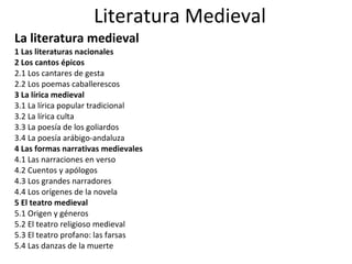 El documento resume los principales géneros y características de la literatura medieval europea. Explica que surgieron las literaturas nacionales anónimas, las cuales incluyen cantares de gesta como La Chanson de Roland, y poemas caballerescos como los de Chrétien de Troyes. También cubre la lírica popular y culta, las formas narrativas como cuentos y el teatro medieval religioso y profano.