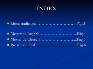 Este documento resume diferentes géneros literarios de la Edad Media en España y Portugal, incluyendo la lírica tradicional como las jarchas, cantigas de amigo y canciones populares. También describe los cantares de gesta como El Cantar de Mio Cid y las Mocedades de Rodrigo, así como el mester de juglaría y el mester de clerecía. Finalmente, ofrece una breve introducción sobre la prosa medieval.