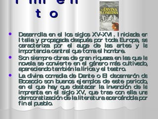 El documento resume los principales movimientos literarios desde la Edad Media hasta el siglo XIX en Europa, incluyendo el Renacimiento, Neoclasicismo, Romanticismo y Realismo. También menciona que el Modernismo fue el primer movimiento literario y artístico de habla hispana en América y tuvo influencia no solo en escritores de América sino también de España.