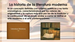 Este documento presenta una introducción a varios movimientos literarios modernos como el romanticismo, realismo, naturalismo y modernismo. Define sus características principales como el predominio del yo, la evasión de la realidad y el nacionalismo para el romanticismo; la representación objetiva de la sociedad para el realismo; la influencia del positivismo y determinismo para el naturalismo; y la primacía del prosaísmo para el modernismo. También presenta breves biografías de autores representativos como José Hernández.