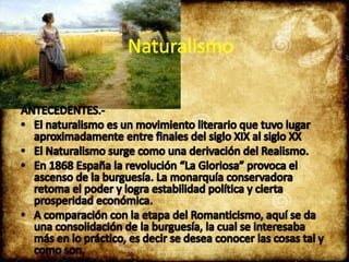 Este documento describe los principales movimientos literarios de los siglos XVIII y XIX: Romanticismo, Realismo y Naturalismo. El Romanticismo se desarrolló entre los siglos XVIII-XX y se caracterizó por el predominio del yo, la evasión de la realidad y la naturaleza silvestre. El Realismo surgió en el siglo XIX e intentó describir la nueva realidad industrial y burguesa de forma rigurosa. El Naturalismo llevó aún más lejos la descripción de la realidad, incluyendo sus aspectos más sórdidos.