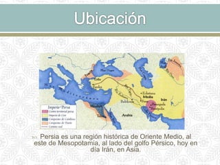 Este documento resume la historia, cultura y literatura de Persia. Explica que Persia era una región histórica en Oriente Medio habitada por pueblos indoeuropeos que adoptaron el zoroastrismo. La literatura persa abarca 2500 años e incluye obras clásicas de autores como Ferdowsi, Hafiz, Rumi y Omar Jayyam. Su literatura se dividió en períodos preislámico, medieval y moderno y ha influenciado a poetas occidentales.