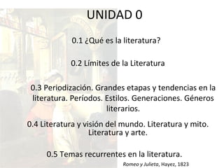El documento presenta una introducción a la literatura universal como materia optativa de segundo curso de bachillerato. Explica brevemente qué es la literatura, sus límites y periodización en grandes etapas y tendencias. También describe los temas recurrentes, géneros literarios y la relación entre literatura, mito y arte. Finalmente, analiza los períodos históricos, estilos literarios, generaciones y clasificación tradicional de géneros.