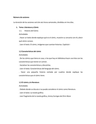 El documento habla sobre la justificación de estudiar literatura y cómic en el aula. Explica que el cómic ha evolucionado de ser solo entretenimiento a convertirse en un género más complejo que cuenta historias fantásticas ligadas a la realidad a través de revistas, tomos y novelas con personajes más humanos. Esto permite que el lector desarrolle competencias lingüísticas y de comunicación al comprender tanto el mensaje de las palabras como de los dibujos. El objetivo es despertar la creatividad e interés literario en los