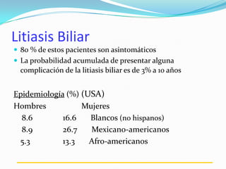 1) La litiasis biliar afecta más a mujeres y personas de raza blanca no hispana, y la mayoría de pacientes con litos son asintomáticos.