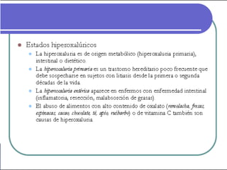 El documento describe la anatomía del sistema urinario, incluyendo los riñones, uréteres, vejiga y uretra. Explica que los uréteres son conductos que transportan la orina de los riñones a la vejiga y que pueden obstruirse, causando litiasis urinaria. También describe las formas agudas y crónicas de litiasis, así como los métodos de diagnóstico y tratamiento.