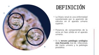 La litiasis renal afecta entre el 1-15% de la población, con mayor incidencia en hombres y en meses cálidos debido a la baja ingesta hídrica. La etiología de los cálculos varía, con predominancia del oxalato cálcico, y su diagnóstico se basa en pruebas como ecografías y TAC. El tratamiento incluye medidas analgésicas, hidratación y, en casos severos, derivación a urología para manejo especializado.