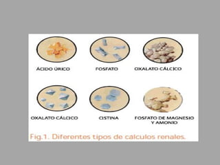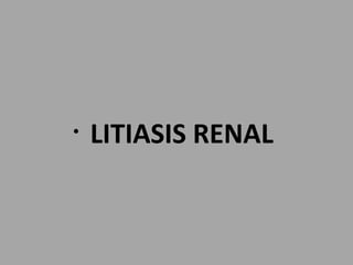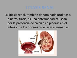 La litiasis renal, también conocida como cálculos renales, ocurre cuando se forman piedras en los riñones o vías urinarias. Los cálculos renales más comunes están formados por calcio y ocurren cuando hay altos niveles de calcio o condiciones en la orina que favorecen su precipitación. Otros tipos incluyen cálculos de ácido úrico o estruvita. Los factores de riesgo incluyen dietas altas en calcio, proteínas o sal, e infecciones urinarias repetidas. Los síntomas