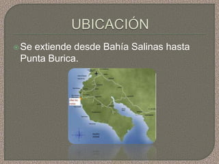 La costa Pacífica de Costa Rica se extiende desde Bahía Salinas hasta Punta Burica, es irregular debido a la cercanía de la montaña y contiene hermosas playas. Alberga áreas protegidas como la isla del Coco y los puertos principales de Puntarenas, Caldera, Quepos y Golfito reciben muchos turistas. Es la región costera más extensa del país con 1,254 km de largo.