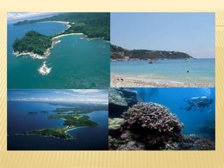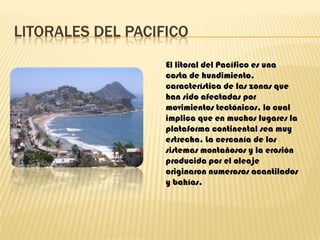 El documento describe los litorales del Pacífico de Costa Rica. Explica que son costas de hundimiento caracterizadas por estrechas plataformas continentales debido a movimientos tectónicos. La cercanía de montañas y la erosión causada por las olas generaron acantilados y bahías. También señala que los cambios climáticos causarán un incremento en el nivel del mar, lo cual ya ha provocado cambios observados en la costa pacífica y atlántica de Costa Rica.
