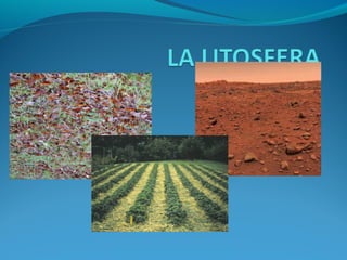 La Tierra está formada por capas concéntricas: la litosfera (corteza), mesosfera (manto) y núcleo. La litosfera está compuesta de rocas y minerales y se divide en suelos de acuerdo a su composición, como suelos arcillosos, arenosos y orgánicos. La erosión del suelo por agua y viento reduce su fertilidad, por lo que es importante la reforestación y uso controlado de fertilizantes y plaguicidas para conservar los suelos.
