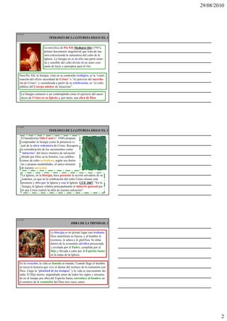 La liturgia celebra principalmente el misterio pascual de Cristo mediante ritos como la Eucaristía y el Triduo Pascual. Estas celebraciones hacen presentes los acontecimientos salvíficos de Cristo de modo que los fieles puedan vivir de él y dar testimonio al mundo. La liturgia recuerda el pasado pero también actualiza los acontecimientos salvíficos haciéndolos presentes, manifestando la obra de salvación de Cristo en el tiempo de la Iglesia.