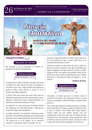 El documento presenta tres lecturas de la liturgia de la palabra de la Basílica del Señor de los Milagros de Buga. La primera lectura describe la creación del hombre y la tentación en el jardín del Edén. La segunda lectura explica cómo la desobediencia de Adán condujo al pecado y la muerte para la humanidad, pero la obediencia de Jesucristo condujo a la justificación y vida para todos. La tercera lectura analiza las tres tentaciones de Jesús en el desierto y ofrece consejos para vencer las tentaciones actuales a trav