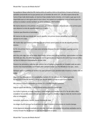 Este documento narra la historia de un hombre que celebró su cumpleaños número 21 con amigos y familiares. Más tarde esa noche, sus primos menores descubrieron imágenes gore en su computadora, lo que los traumatizó. Años después, durante la celebración de su cumpleaños 25, el hombre despertó con un amigo muerto frente a él y sus primos confesaron haberlo asesinado, mostrando signos de psicopatía.