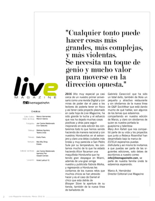Este documento resume la edición de marzo 2016 de la revista digital Live Magazine Honduras. Presenta entrevistas y reportajes sobre moda, belleza, gastronomía y tecnología en Honduras. Incluye fotografías y artículos sobre ropa de baño diseñada por Gabriela Caraccioli, un perfil de la maquillista hondureña Alice Yacaman en Miami, y Mary Ann Kafati en la portada promocionando su marca de moda Estela. También presenta reportajes sobre nuevas tiendas, restaurantes y líneas de ropa en Honduras