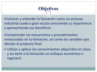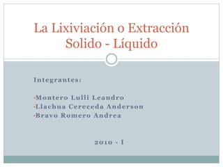 El documento describe el proceso de lixiviación o extracción sólido-líquido. Explica que la lixiviación es un proceso industrial usado para extraer solutos de un sólido mediante un disolvente líquido. También describe los equipos y variables involucradas en el proceso de lixiviación a gran escala y de laboratorio.