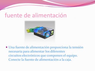 Este documento describe los principales componentes de una computadora y cómo conectarlos. Explica que una fuente de alimentación proporciona energía a los circuitos electrónicos, y que la motherboard conecta todos los componentes como la CPU, memoria RAM y tarjetas de expansión. Detalla cómo instalar la unidad de disco duro, unidades ópticas, y conectar los cables internos entre los dispositivos. Finalmente, indica conectar los cables externos a los puertos traseros para completar el ensamblaje, incluyendo cables de monitor, teclado